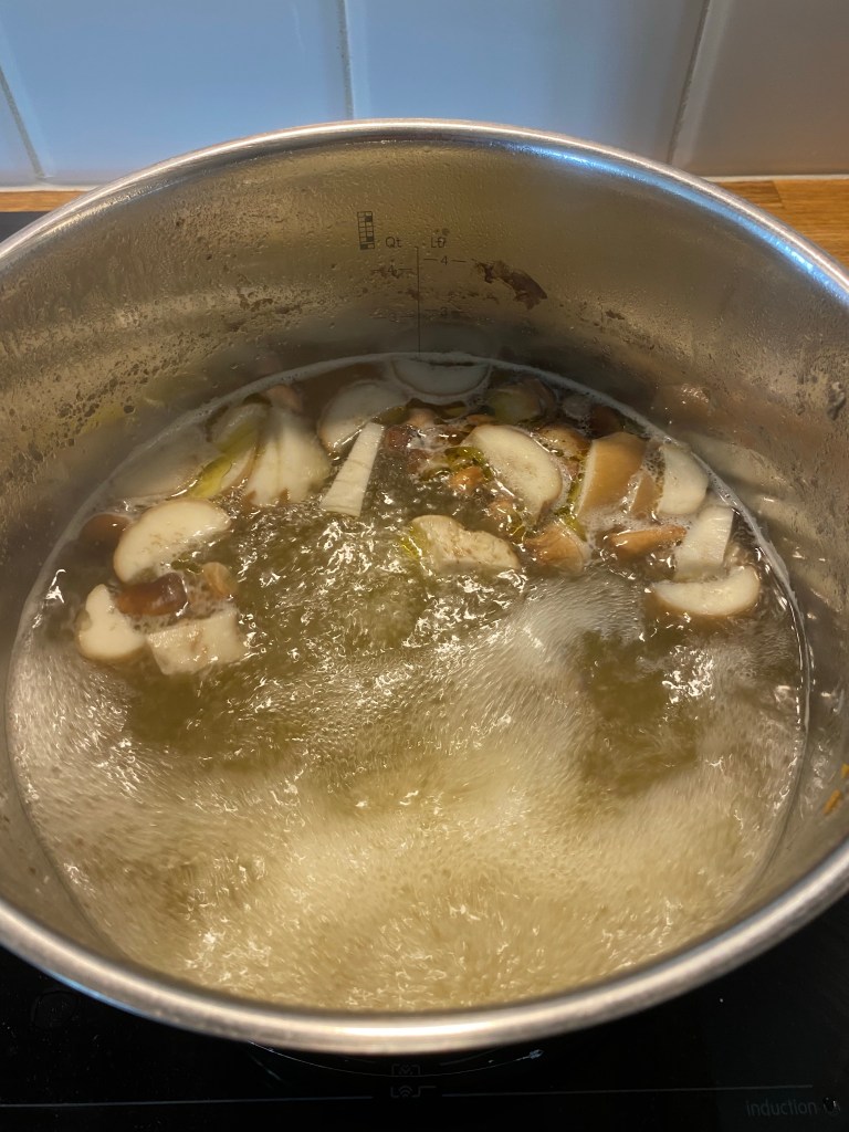 Skiva bort fötterna från Karl-Johan- och shiitakesvamparna och skiva dem grovt. Fräs svampfötterna en stund i smör och olivolja. Salta. Ta i kycklingfond med svampfötterna. Låt puttra en stund så att svampsmaken kommer in i fonden. Ta i lite vatten om det verkar reducera. Håll fonden varm.
