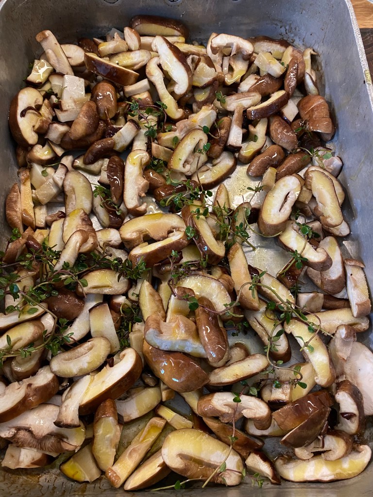 Sätt ugnen på 225 grader. Skiva Karl-Johan- och shiitakehattarna grovt. Lägg i en form och ringla över olivolja och ta i några kvistar timjan. Salta och rör ihop. Sätt in i ugnen och stek. Kolla då och då och rör om.