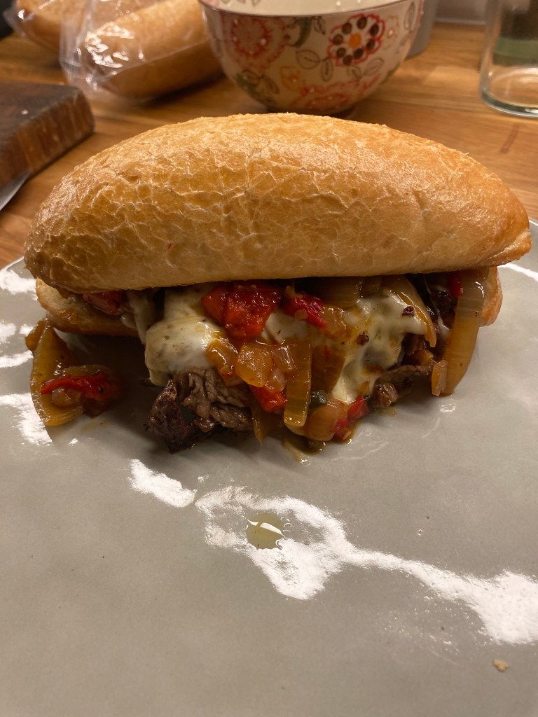 Åt denna macka en gång i Philadelphia för många år sedan. Det här receptet är en variant på Jonas Crambys recept från boken ”Mackor” som jag kan rekommendera! Om du vill baka egna hoagies kan du använda receptet för brioche på min blogg. Forma dem som avlånga, lite större bröd bara.