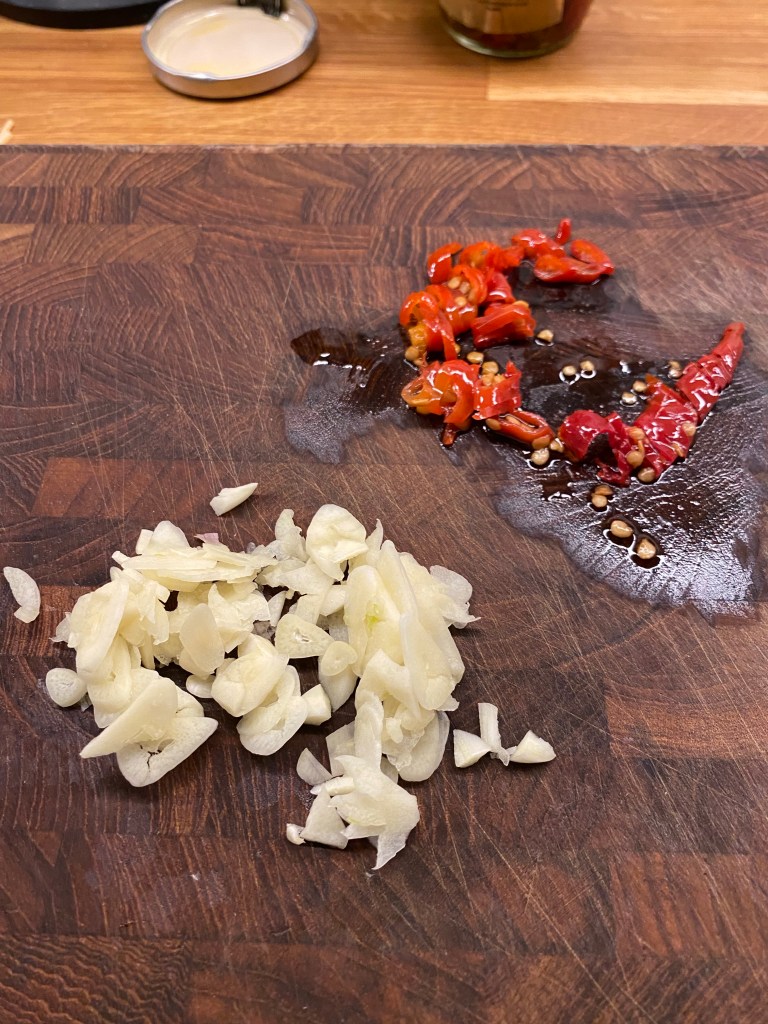 Skiva chili och vitlök fint.