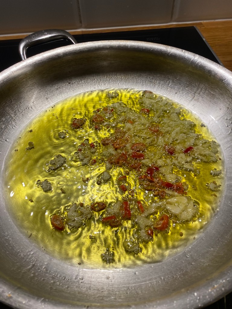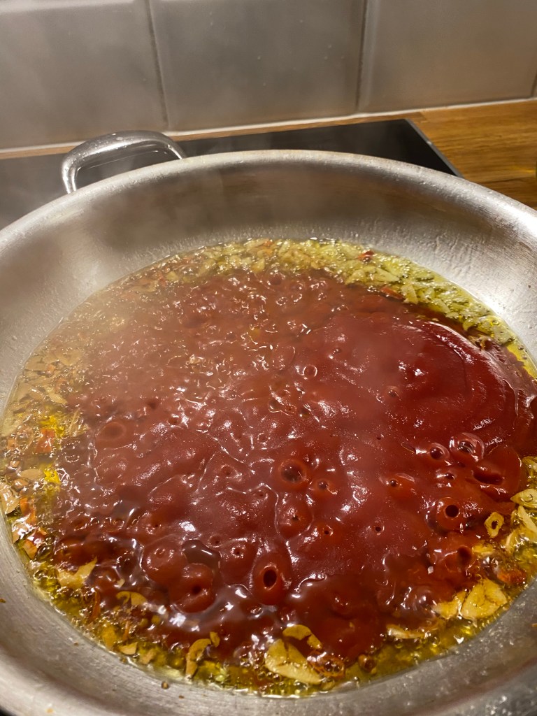 Ta i ca 1,5 dl olivolja i pannan och ta i chili och vitlök. Låt det fräsa i ca 20 sekunder. Ta i passerade tomater och låt det hela puttra ihop och tjockna. Det tar inte lång tid och rör hela tiden.