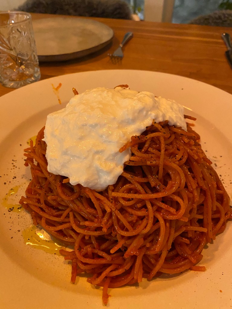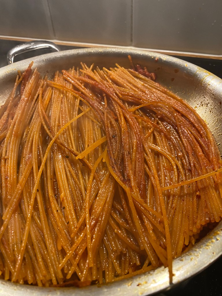 Här ska spaghettin stekas och få en lite bränd yta. Slutresultatet blir en pasta som är mer al dente än vad man är van vid och en delvis knaprig yta. Låter konstigt, men det är väldigt gott. Tyvärr blev min uppläggning inte den snyggaste.