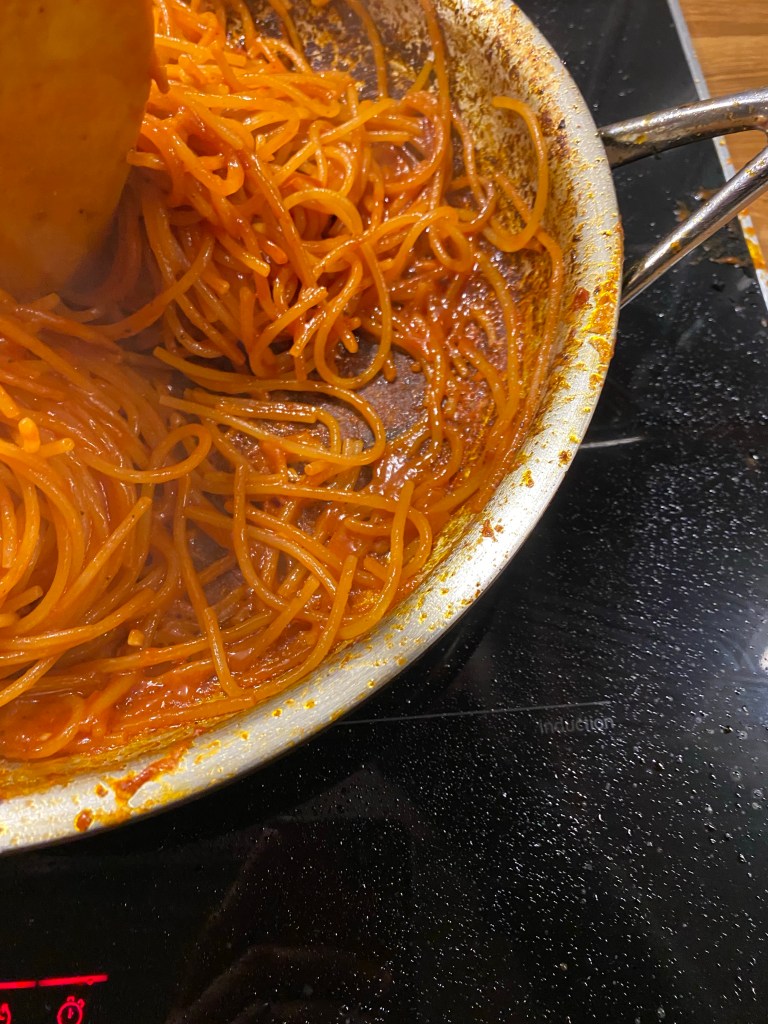 Pastan börjar nu att absorbera såsen och bör bli lite mjukare så du kan fördela den jämt över pannans botten. Vänd på den då och då, men inte för ofta då du vill att så många som möjligt av spaghettistråna ska få lite färg.