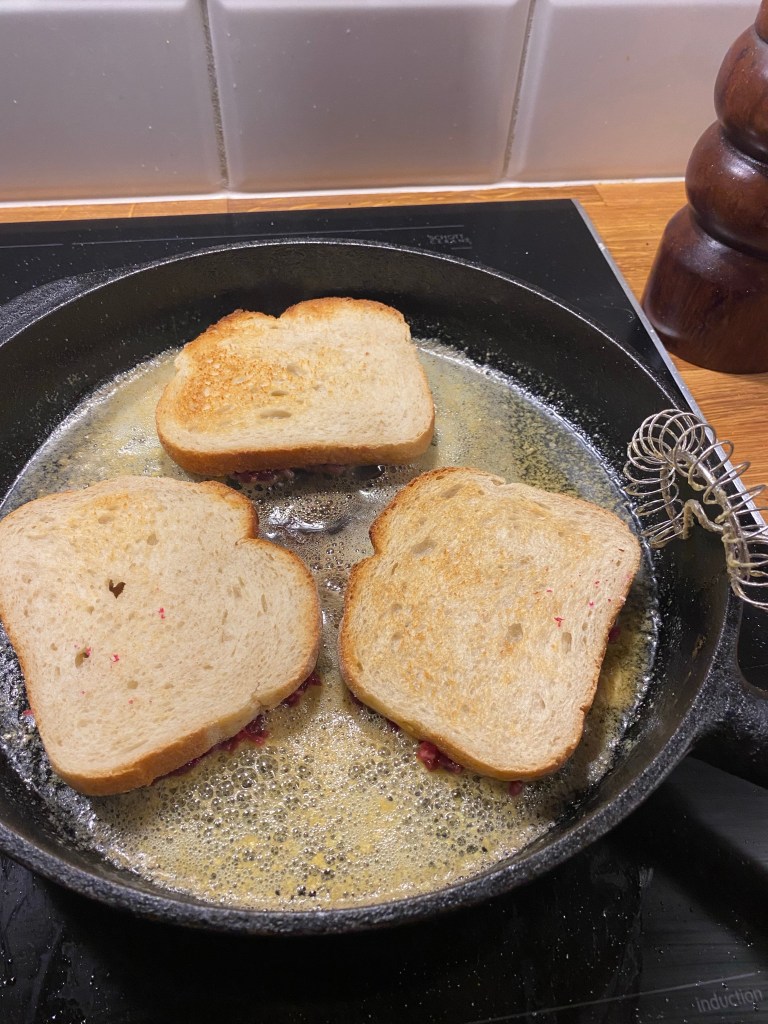 Lägg i tre smörgåsar med färsen nedåt i varje panna. Stek i ca 5 minuter. Vänd på smörgåsarna och fortsätt stek. Senapsmöret kommer nu att sugas upp av brödet.